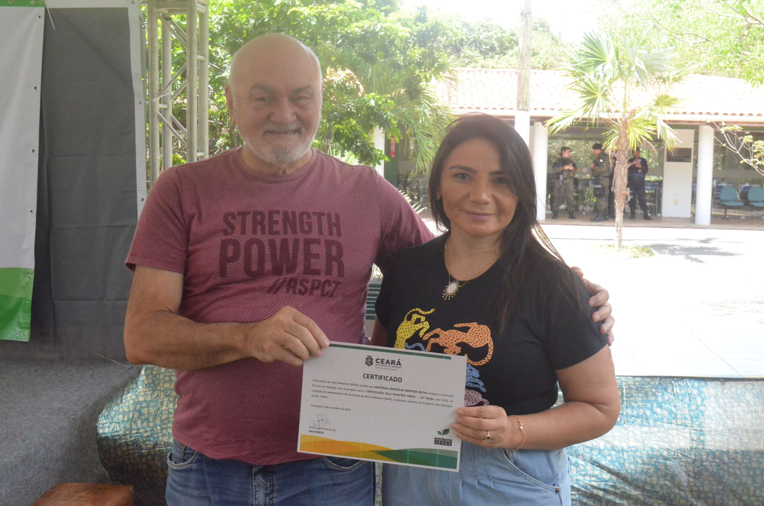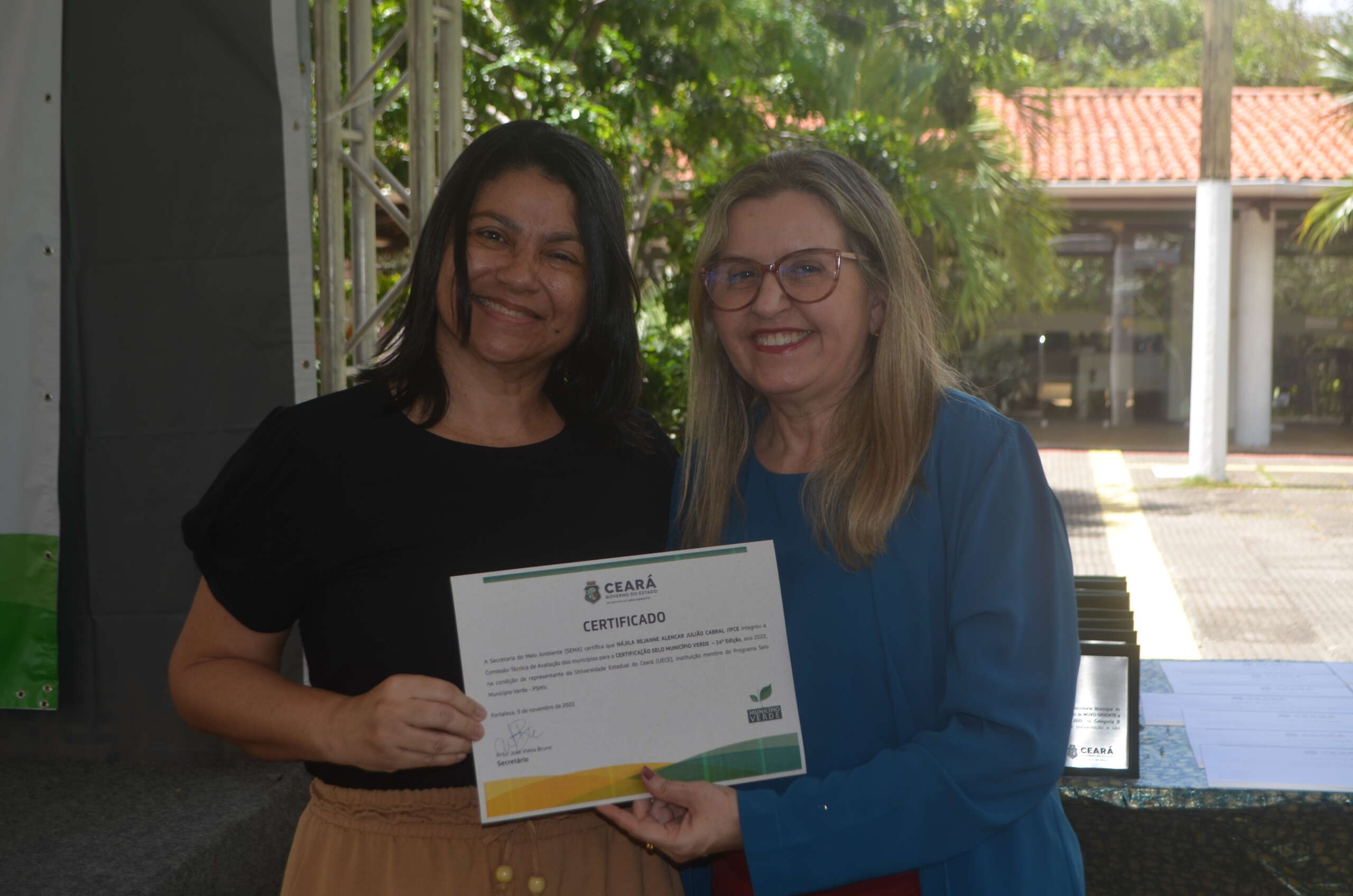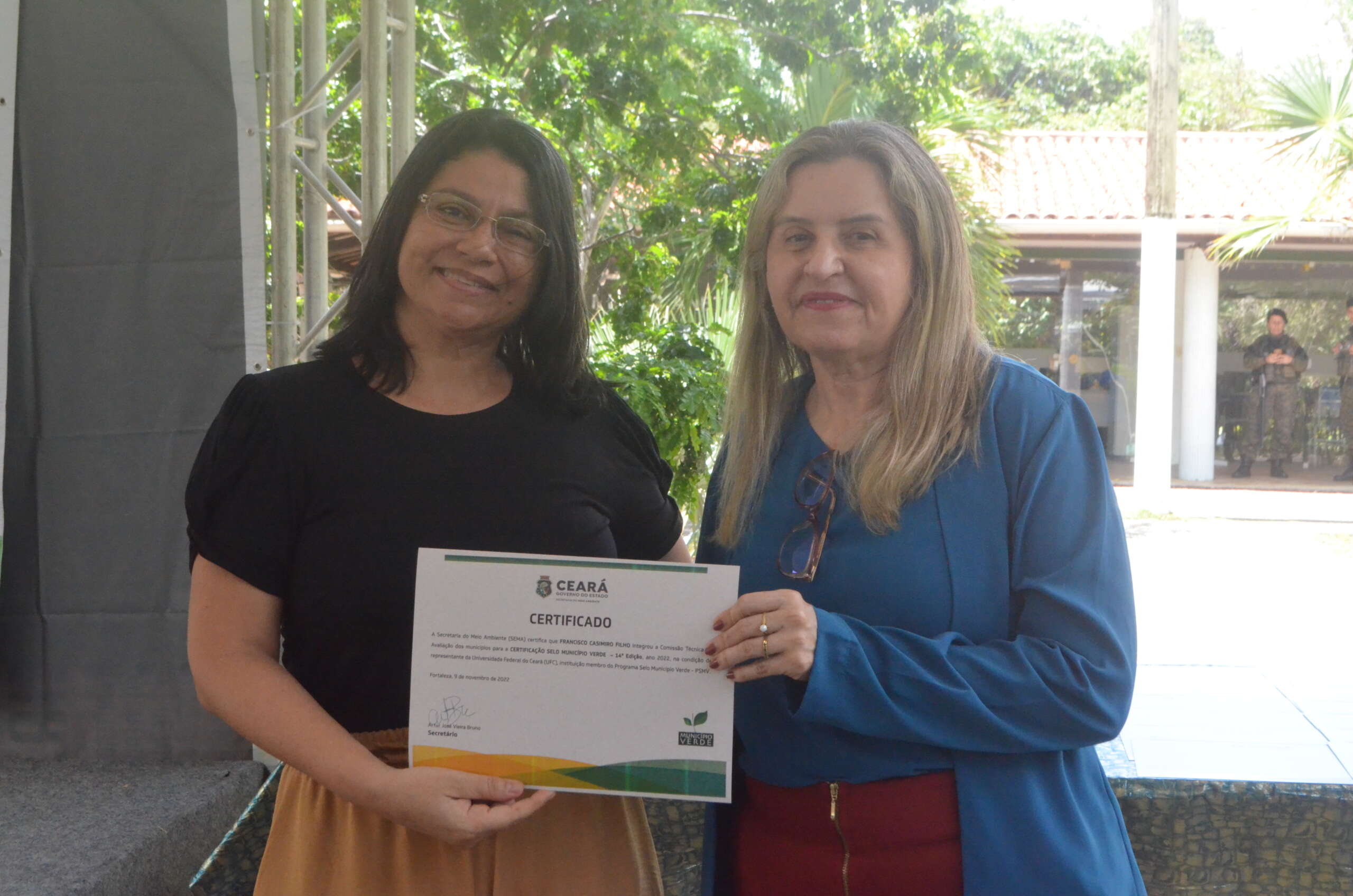 Em reconhecimento pelos trabalhos de avaliação que realizaram nesta 14ª Edição, os membros participantes da Comissão Técnica do Programa Selo Município Verde, receberam um certificado: Antonia Massilia Santos Silva e Maria do Socorro Ferreira de Azevedo (Sema), Francisco Casimiro Filho e Patrícia Verônica Pinheiro Sales Lima (UFC), José Iramilson Costa Pereira (Agace), Maria Alice Guedes (SRH) e Nájila Rejanne Alencar Julião Cabral (IFCE). Além disso, foram agraciados com uma placa de Menção Honrosa José Iramilson Costa Pereira; Maria Dias Cavalcante – representante da SEMA no Comitê Gestor e Secretária Executiva da SEMA – e Artur Bruno. Maria Dias falou pelos homenageados.