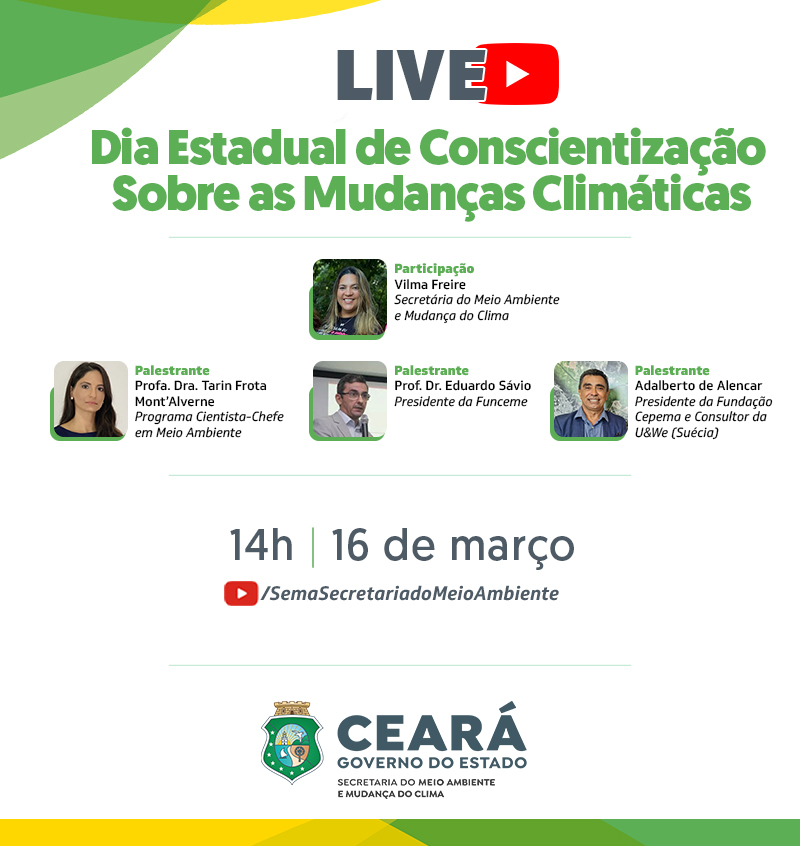 A Secretaria do Meio Ambiente e Mudança do Clima (Sema) realizará nesta quinta-feira (16), a partir das 14h, o seminário virtual, “O Panorama das Mudanças Climáticas no Ceará”. O evento que será transmitido pelo YouTube da Sema, acontece em alusão ao Dia Estadual da Conscientização sobre as Mudanças Climáticas (Lei nº 15.237/2012) e ao Dia Nacional de Conscientização sobre Mudanças Climáticas (Lei nº12.533/2011), ambos celebrados em 16 de março.