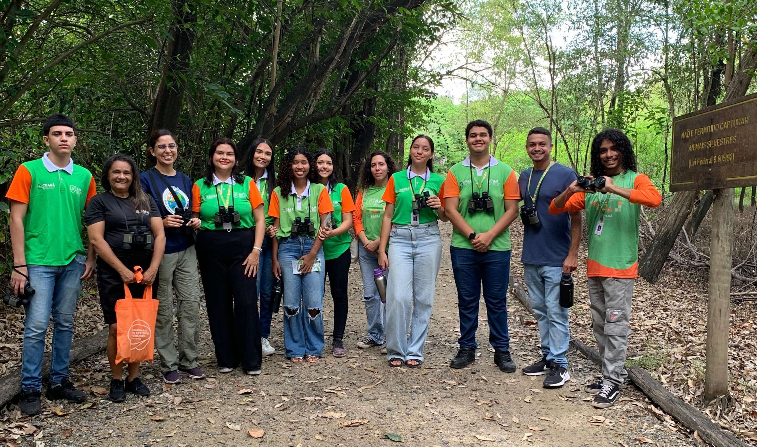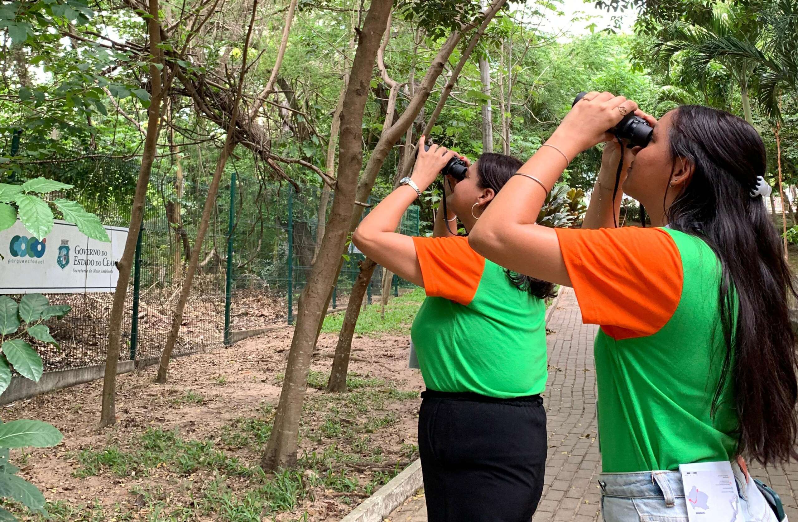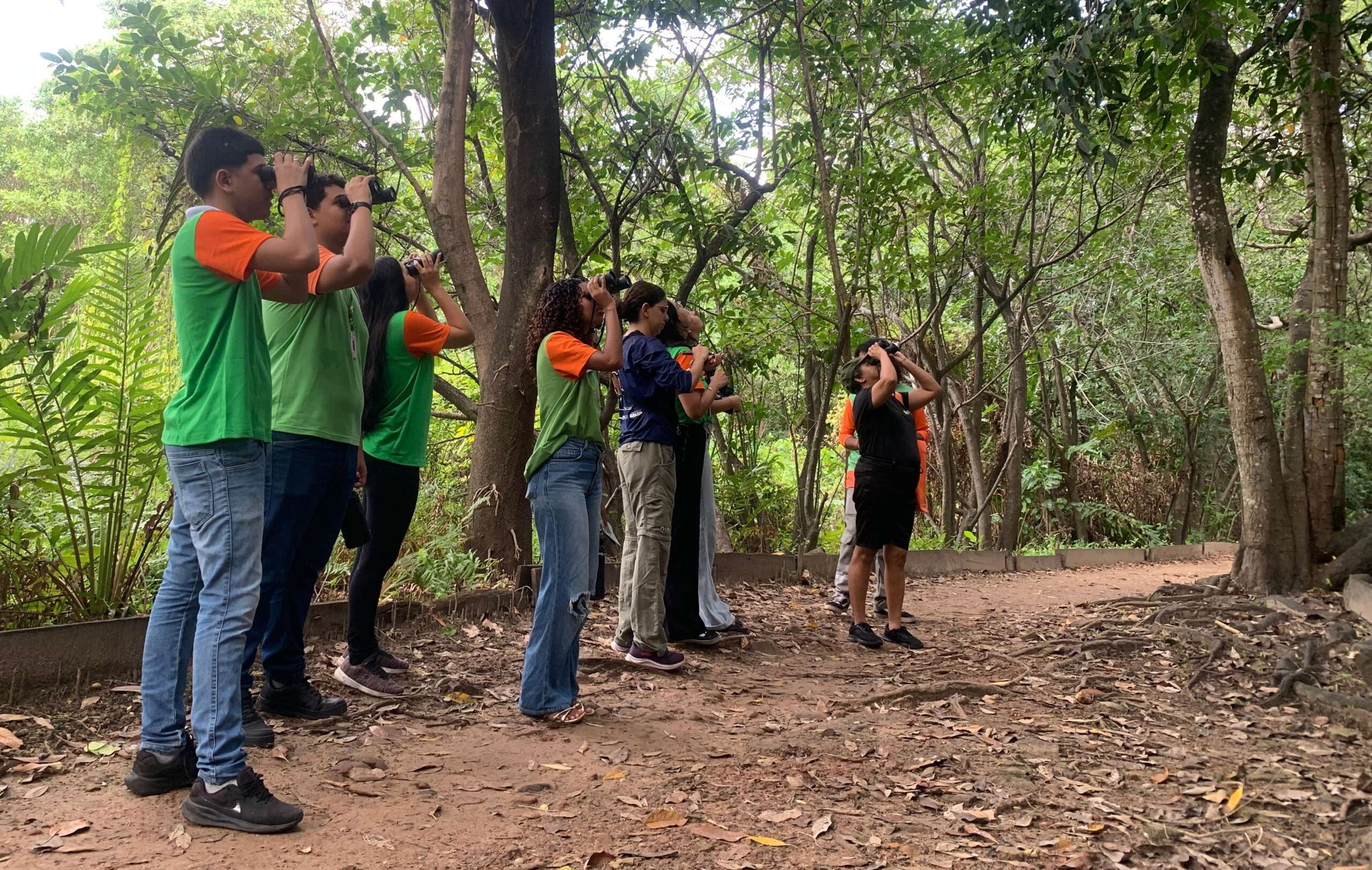 Na manhã desta sexta-feira (27), o Parque Estadual do Cocó foi palco de uma atividade especial voltada à observação de aves. A ação reuniu integrantes do Programa Agente Jovem Ambiental (AJA) e educadores, todos atuando no Parque, e contou com uma trilha guiada, conduzida pela técnica da Coordenadoria de Biodiversidade (Cobio) da Secretaria do Meio Ambiente e Mudança do Clima (Sema), Giovanna Rodrigues.